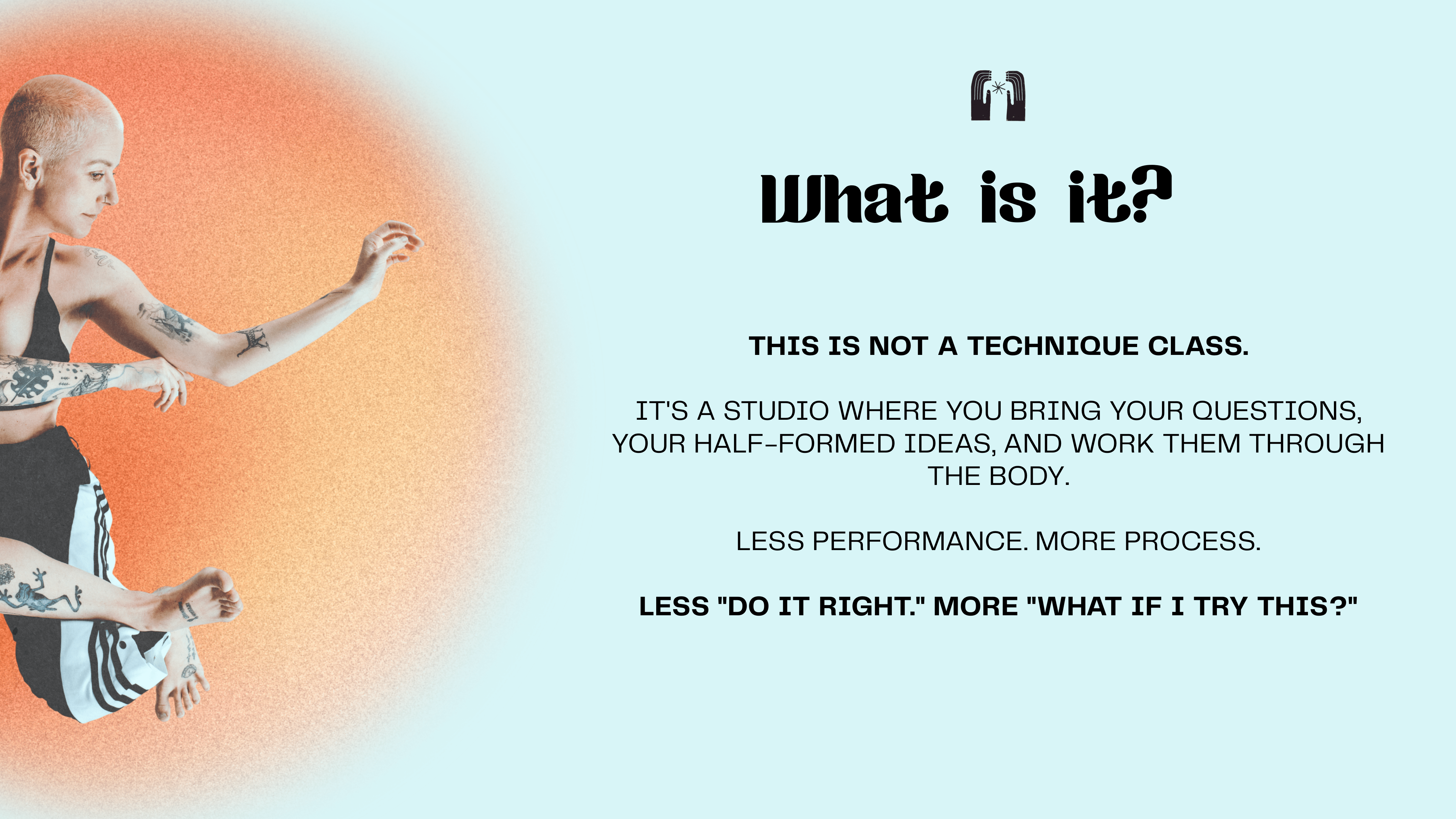- Early-career dancers, movers, choreographers, and interdisciplinary dreamers who are ready to take their practice seriously but do not necessarily feel “established” yet.